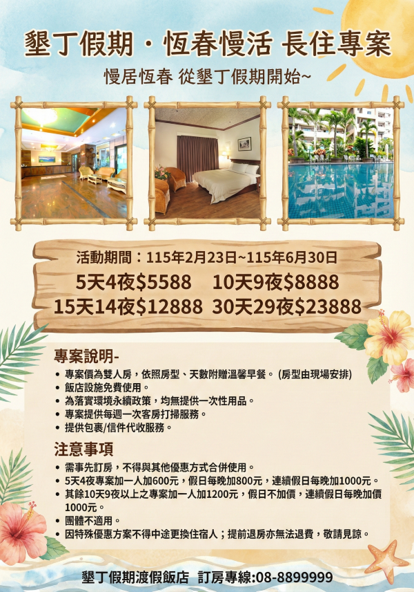 慢下來,讓生活更有溫度 🌴適合遠距工作、旅居放鬆或長假休息的旅客更多詳情請參考下方圖片訂房專線|08-8899999若有訂房相關需求.訂房電話忙線時.歡迎洽詢業務部訂房高雄業務 07-3323990 台北業務 02-27312506上班時間: 09:00~18:00